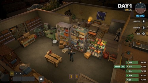 2、避难所建设与资源精细管理:采购的物资需要运回你的初始避难所(如公寓)。你可以使用工具加固门窗、设置陷阱。灾难爆发后,游戏进入“避难所生存”阶段,你需要像经营模拟游戏一样,精细管理角色的饥饿度、口渴值、健康状态和精神状态,合理分配和使用每一份物资。