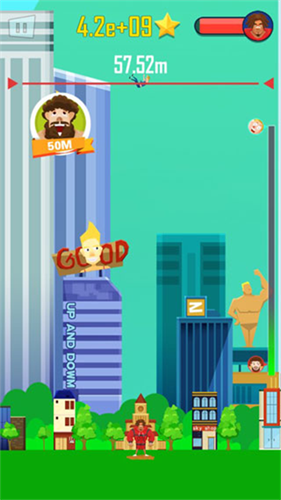 2、抛出人物会飞到空中,人物抛得越高得分就越高。抛出人物后在将要落地时再次点击屏幕,可以将游戏人物再次抛出。累计抛出的越高,得分就越高