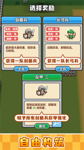 1、游戏中,每关包含 10 回合激战,而你的每一步决策都始于回合前的 “三选一” 卡牌抉择。是招募一队 32 人的剑盾兵构筑坚实防线,还是为现有剑盾兵添上反甲强化,让近战敌人付出惨痛代价?