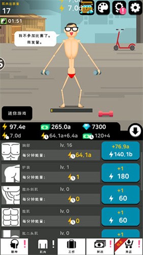 2、使用各种各样的技能获得更大的收益,快速成为肌肉王;