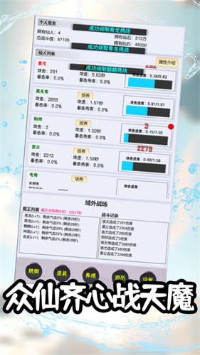 4、全面文字,所有的仙人列表、属性、攻击速度以及战斗记录等都是用文字的方式给大家呈现。