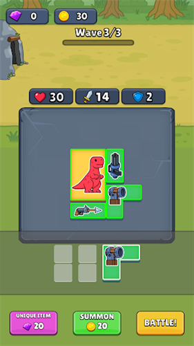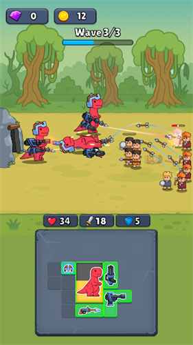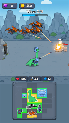 1、在网格上排列你的恐龙和武器,将它们正确排列,并聚集你不可阻挡的恐龙军队,还能装备上武器,去消灭出现的敌人。