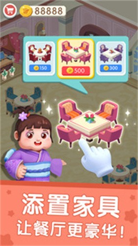 经营餐厅,积累财富,获取建设餐厅的材料道具,解锁全新国际特色餐厅。