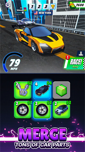 1.合成车身、车轮和发动机,一步一步地升级汽车的零部件,逐步打造出你在赛道上驾驶的终极跑车。