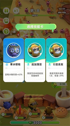 3、每个关卡都有丰富的果实组合,策略运用技能奖励卡牌。