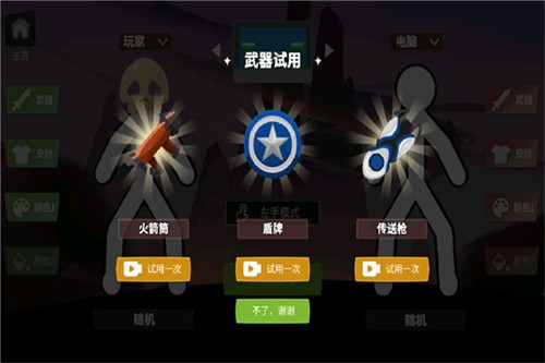 3、包含武器试用功能,像火箭筒、传送枪等武器可试用,还有皮肤、颜色选择及左手模式,个性化设置丰富。