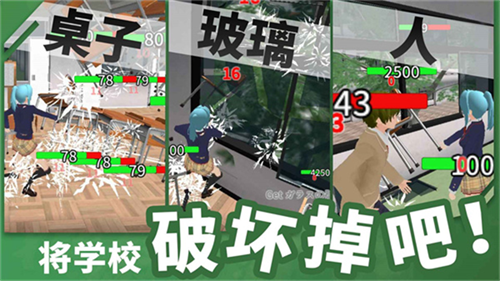 1、校园内所有物品和设施几乎都能破坏,并且攻击时会形成不同的手感和视觉反馈,带来极其精彩的趣味体验。