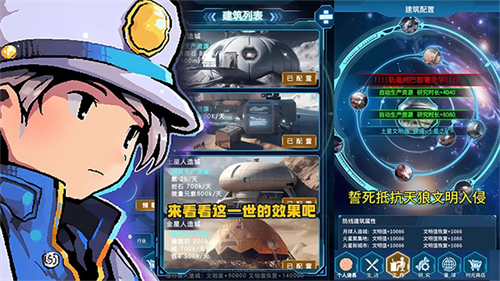 2、基地建设:玩家可以自由搭建和扩展自己的星球基地,通过合理的布局和建筑升级来提升基地的功能和效率。