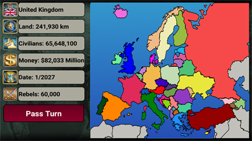 1、玩家需要准备,你需要充分的发展自己的国家并和其他44个AI国家进行作战。