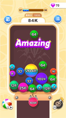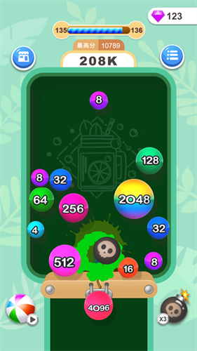 2、努力通过数字相加的规则来让球球合并到一起吧,只要可以让空间留下足够的空当地区你的解谜就还有希望;