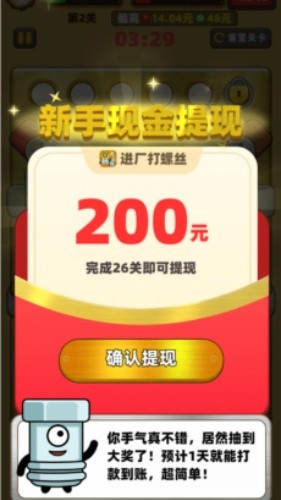 3、红包提现机制真实有效,前期的低门槛红包能够快速建立玩家信心,虽然后续提现需要更多努力,但整体模式比单纯看广告更有诚意和吸引力。