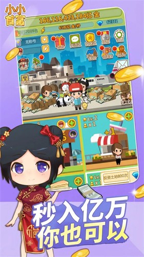 小小首富内购破解版是一款策略型的养成类游戏,建立高楼大厦,招商引资促进经济的增长,从一个小小的老板开始做起,然后成为商业巨鳄,掌控整个商业帝国,做最基本的工作,比如贴手机膜,一点一点的积累资金,开设一个自己的小店,提升这里建筑的等级,然后招募更多的人才与小公司到这里,可以提升赢金的速度,新颖投资系统可以让你买下全国黄金地段,成为房产大亨,房价都在你的控制之中,通过各种工作、买卖、投资、建立等各行各业的发展,并且通过时间的积累与不断的努力寻找发家致富的途径,成为这个城市的超级富豪。