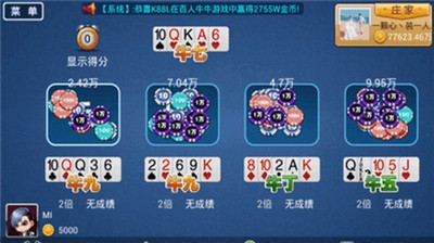 至于到底是牛几,就要看另外2张牌相加之后的个位数。(5,6,7,9,J当中,5+6+9=20为牛,另外两张7+10=17,个位数是7,因此算“牛七”)