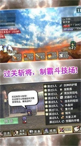 3、通过重重关卡,征服精灵,打败兽人,击溃帝国,抵达异界,制霸斗技场!踏上坎坷的冒险之旅,收集百种武器或是魔法。