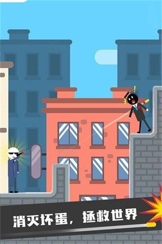 2、剧情闯关模式,每个关卡设置小故事,在火柴人的拯救世界之旅更加有趣,而且不同的障碍阻拦直线子弹,通过物理角度、反弹计算,才能一枪爆头。