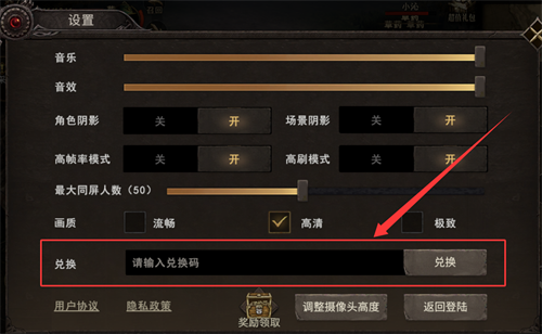 3、再在设置界面下方的”兑换”内输入礼包码即可领取奖励。