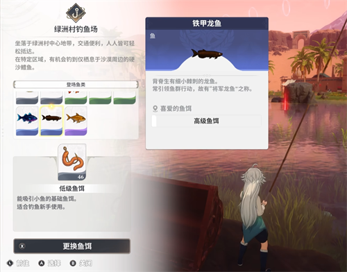 离开湿润的森林和海岸之后,大家就会把目光投向干旱的沙漠地区,那里生活着铁甲龙鱼。正如它的名字所暗示的那样,它有像铠甲一样的坚硬鳞片,可以适应绿洲村特有的水域环境。玩家要去绿洲村的绿洲村钓鱼场垂钓。