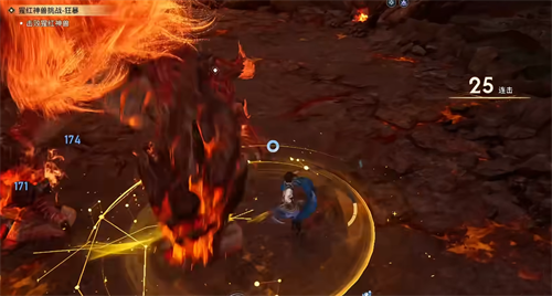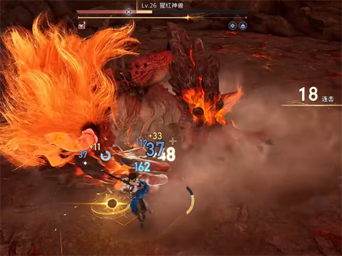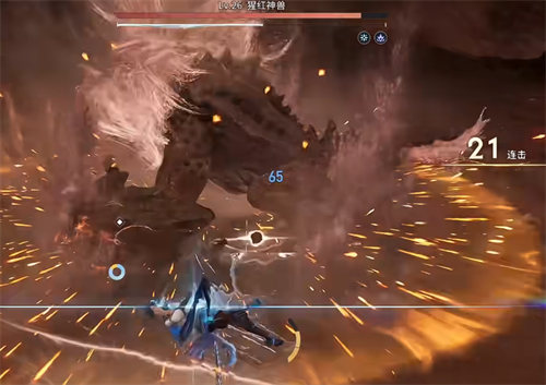 然后还需要去了解boss的机制,比如说去打猩红神兽这个boss的时候,其尾部是最脆弱的,所以需要玩家们去该boss的尾部进行攻击,大概攻击几秒的功夫,该boss就会往下攻击释放一道熔浆,这时候就可以直接闪避,会出现明显的闪光状态,该状态是可以提供几秒无敌的,然后再进行反击就能保持无伤,而且连击次数也会一直存在。